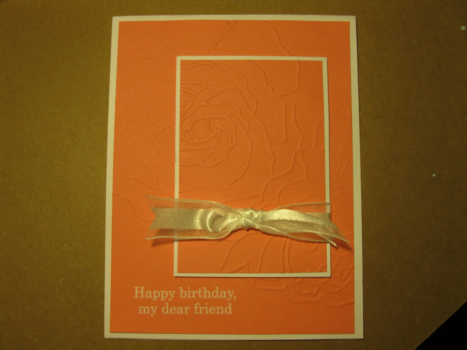 I wish this picture had come out better, because this card is so much cuter IRL! I took velum and ran it through my Big Shot using the Dots Embossing folder. Then I added the ribbon and brads and sentiment. The color is So Saffron and the sentiment is another rub-on (both from SU!).